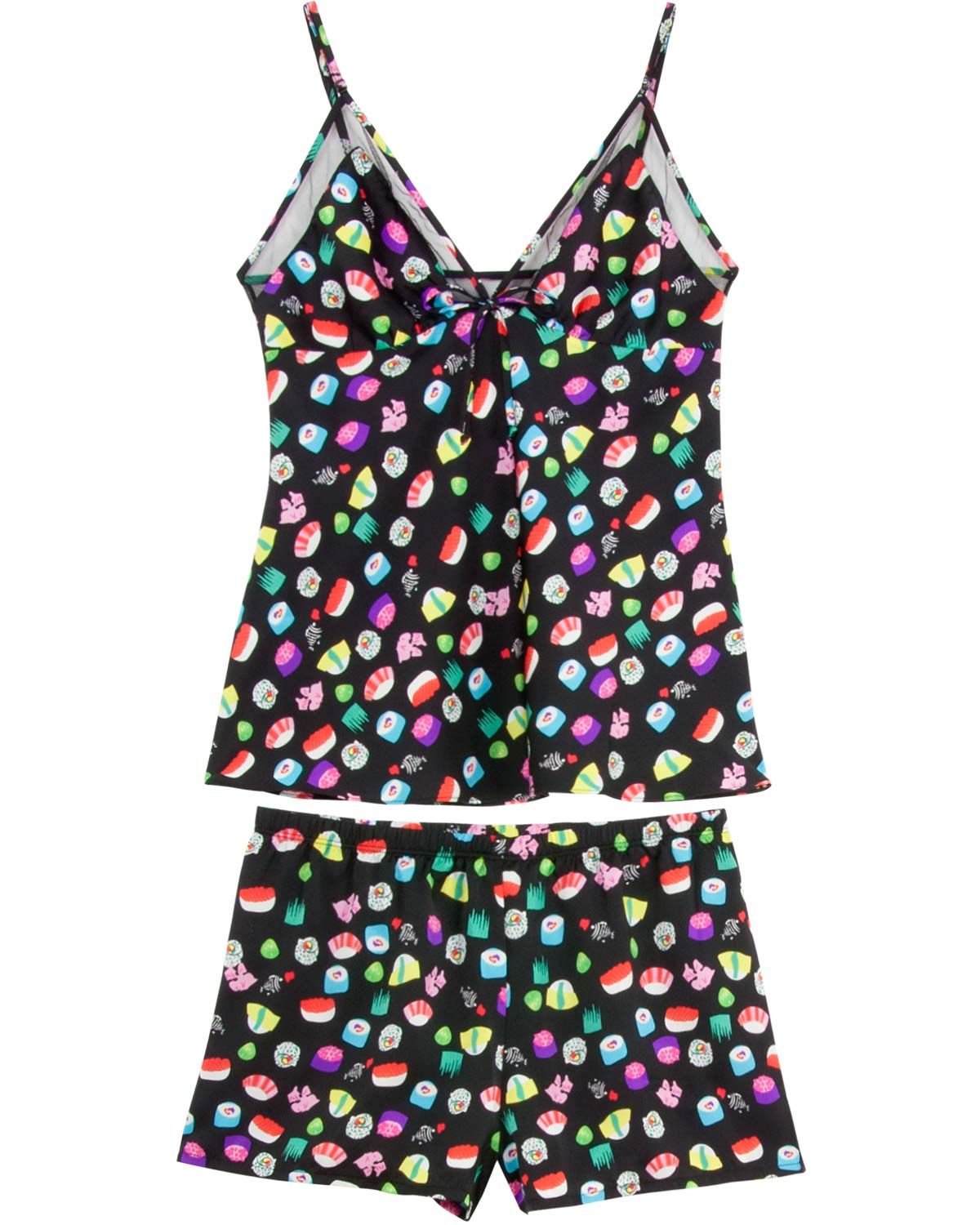 Este short doll é aquela peça diferenciada indispensável que toda mulher moderna e antenada ama. Todo em cetim estampado por sushis, numa modelagem moderna e feminona, com transparencias pontuais, porporcioando um visual feminino , estiloso e sexy na medida.