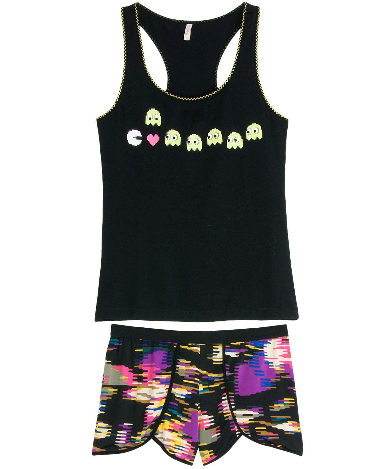 O short doll é sempre a peça favorita para garantir noites confortáveis de verão. E os que abraçam a rotina com leveza e alegria são ainda melhores. Como este modelo com estampa divertida na blusa de camiseta regata, acompanhado de short com corte desojado e estampa colorida, conferindo o visual alegre e feminino da peça.