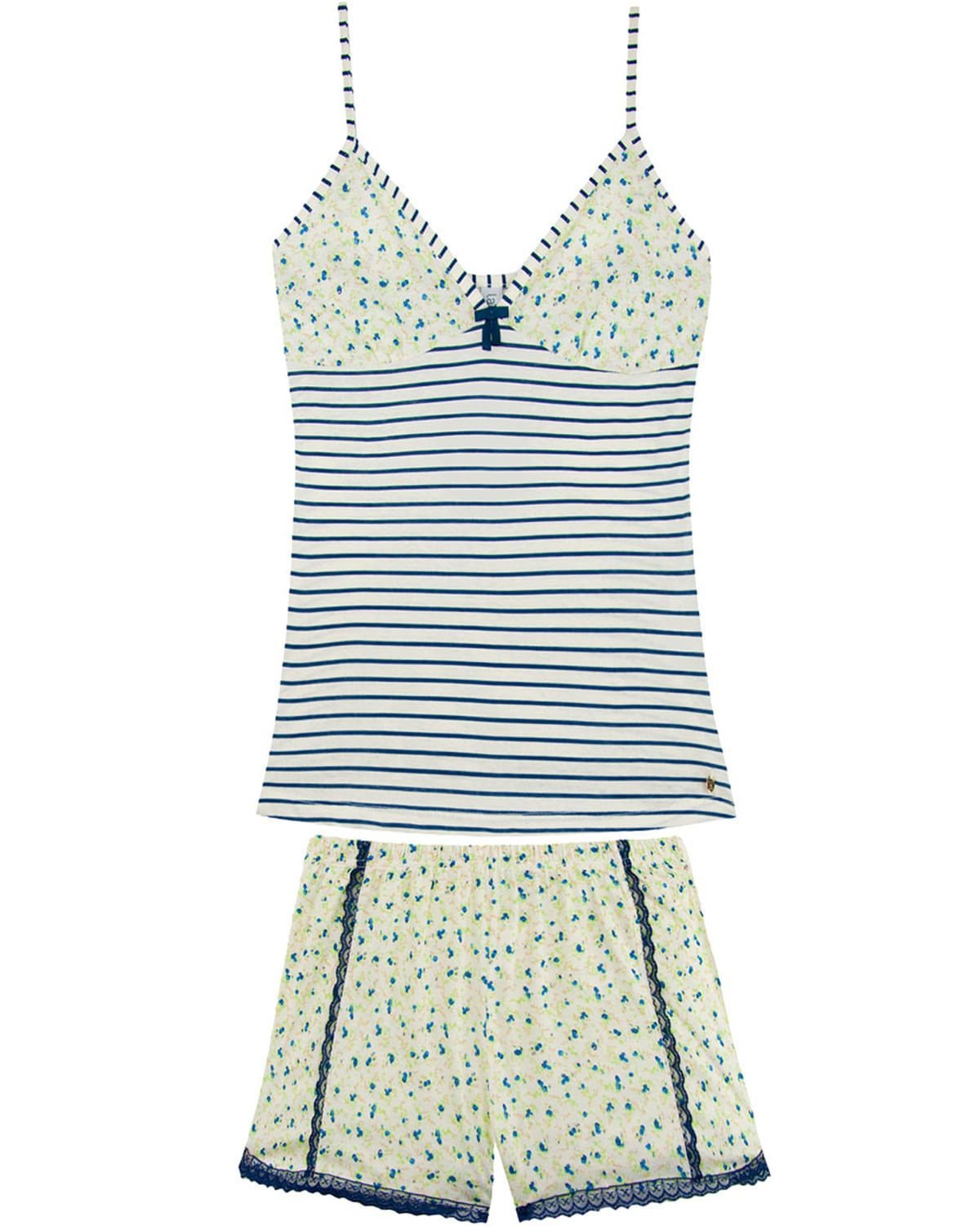 Este short doll é perfeito para noites de conforto. Mixando as estampas floral e listrado, o conjunto é perfeito para noites de temperatura mais quente. A parte superior tem modelagem básica e fresca com alças reguláveis, e a parte inferior conta com detalhes em renda completando o visual feminino e romântico da peça.