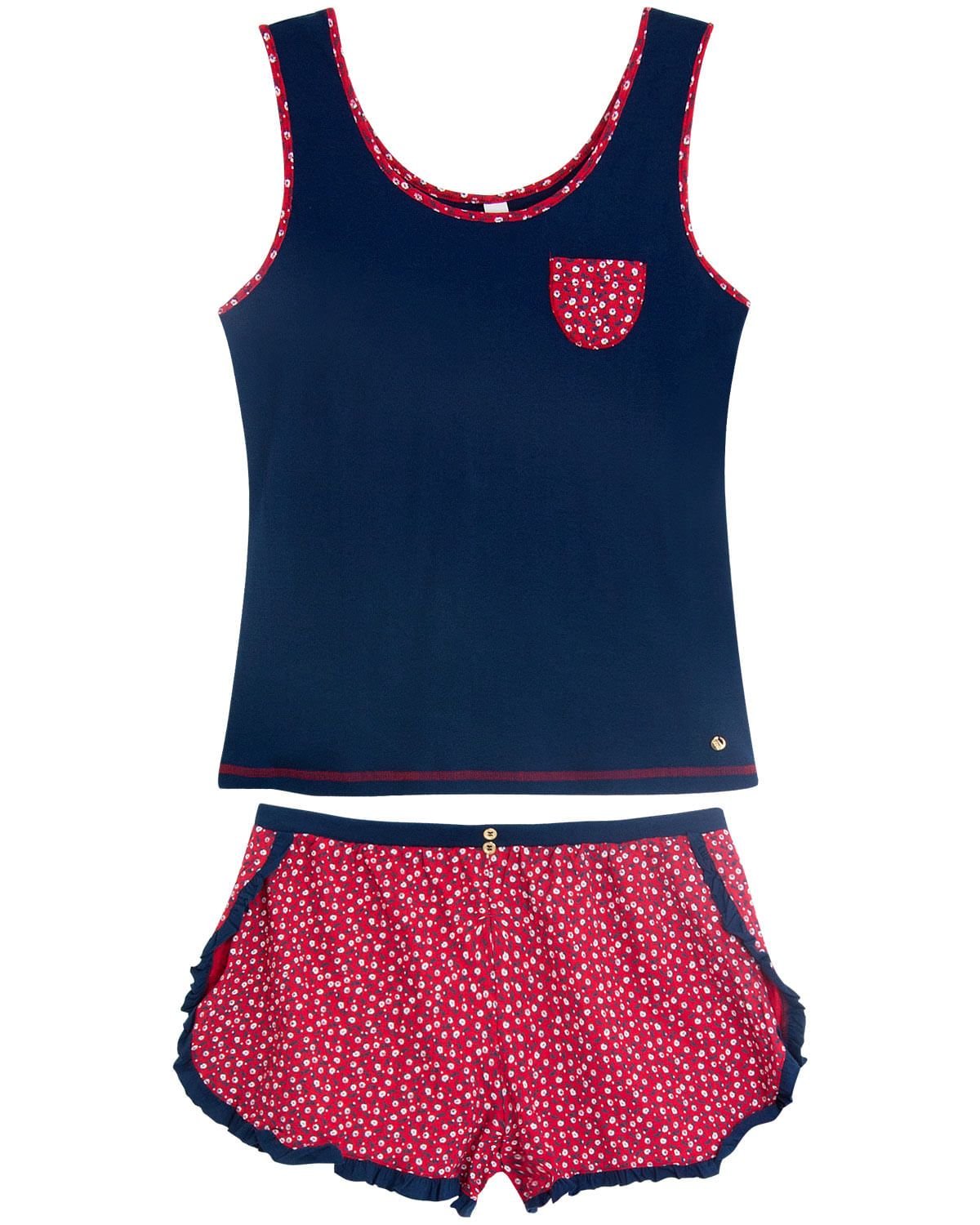 Feito em malha extremamente macia, com short estampado com mini flores e blusa regata com modelagem que se ajusta e modela o corpo, este short doll deixará suas noites de verão ainda mais alegres, femininas e confortáveis.