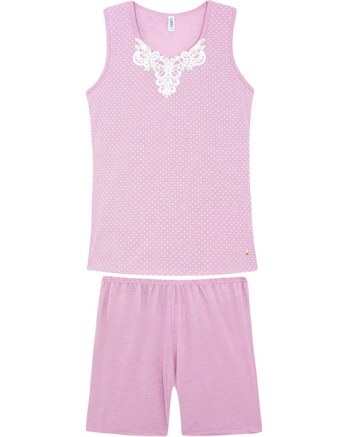 O conforto e a beleza também deve estar presente na hora de dormir. Para isso, este pijama é confeccionado em malha extremamente macia, com bermuda lisa e blusa regata com estampa de bolinhas e aplicação de gripir no busto. É a peça é ideal para noites com temperaturas mais quentes.
