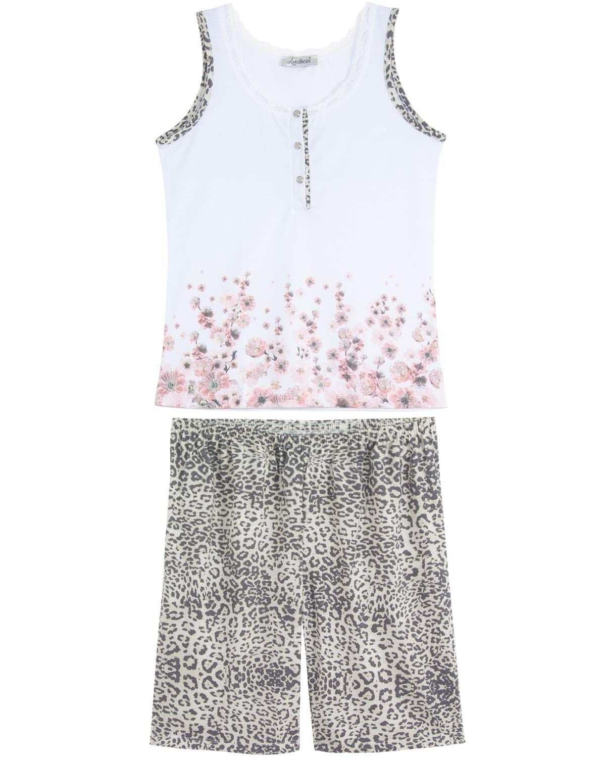 Não existe nada melhor do que a sensação de colocar um pijama fresquinho e confortável em dias quentes de verão. Esse modelo possui camiseta regata com estampa de flores e botões frontais que proporcionam maior praticidade e, compondo o visual moderno, bermuda com estampa animal print de oncinha, esbanjando charme e feminilidade. A malha de excelente qualidade é feita em poliéster e viscose de alta qualidade, proporcionando maior leveza e conforto.