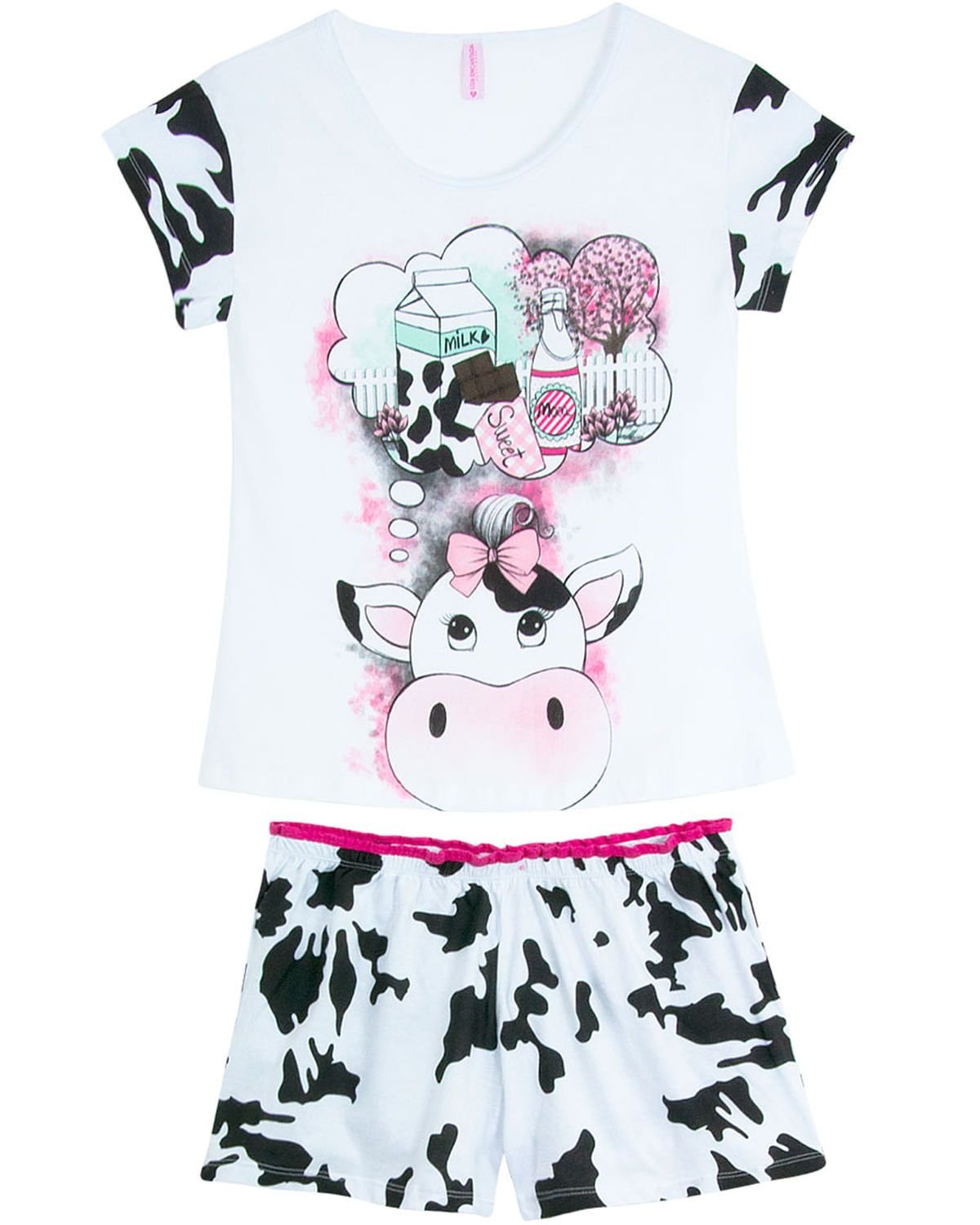 Aquele aconchego necessário e ideal para suas noites de temperatura mais quente. Todo em algodão, com estampa de vaquinha em todo o short detalhado com elástico pink, acompanhado de camiseta manga curta com graciosa estampa de vaquinha e coisas da fazenda. É o pijama ideal para noites alegres, divertidas e cheias de conforto.