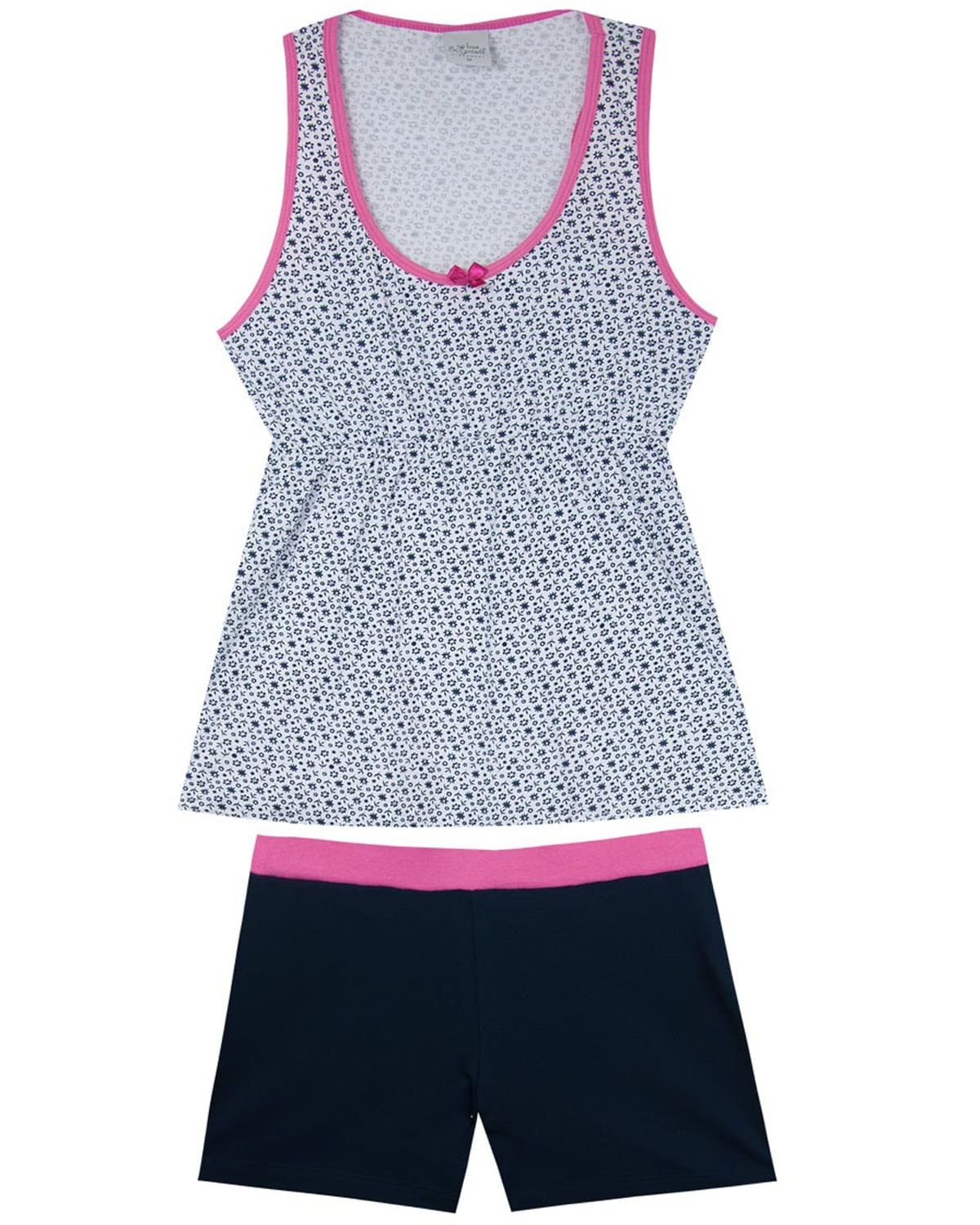 Feito em malha extremamente macia, com short que desenha as formas do corpo e blusa estilo bata estampada com mini flores, o short doll deixará suas noites de verão ainda mais alegres, femininas e confortáveis.