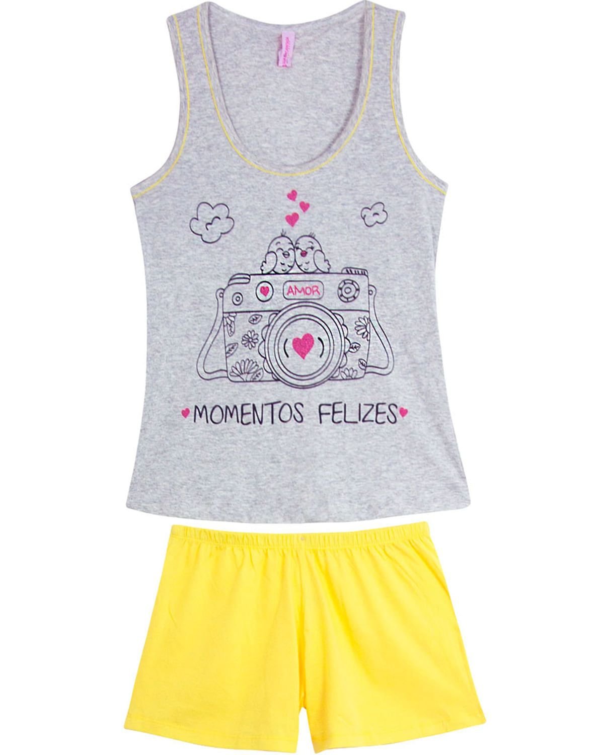 Aquele aconchego necessário e ideal para suas noites de temperatura mais quente. Todo em algodão, com short liso e blusa regata com estampa de maquina fotográfica e passarinhos, completando o visual alegre e divertido nesta peça de verão.