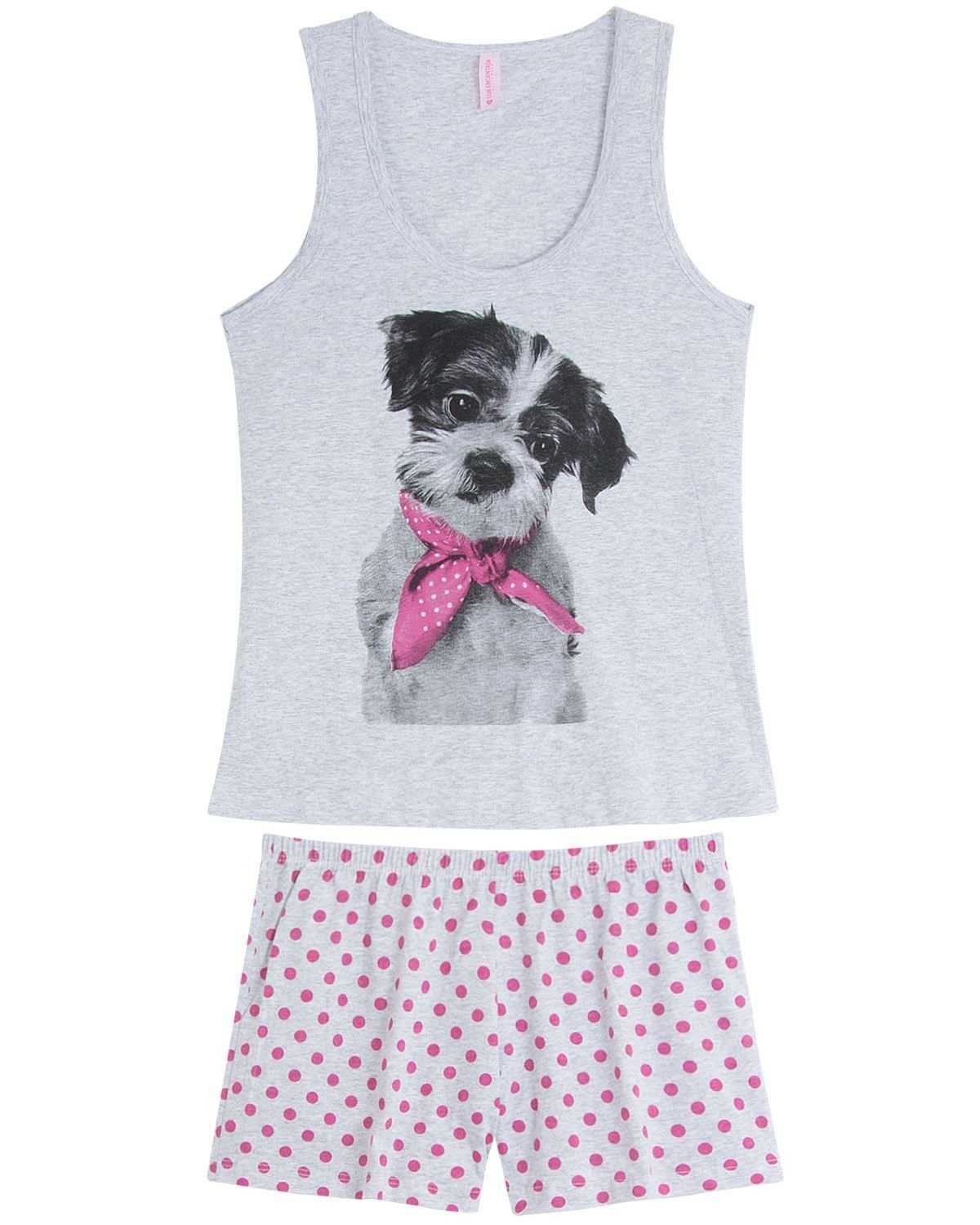 Aquele aconchego necessário e ideal para suas noites de temperatura mais quente. Todo em algodão 100%, com estampa super feminina e graciosa de cachorrinho na blusa e short em poá, completando o visual alegre e charmoso da peça de verão.