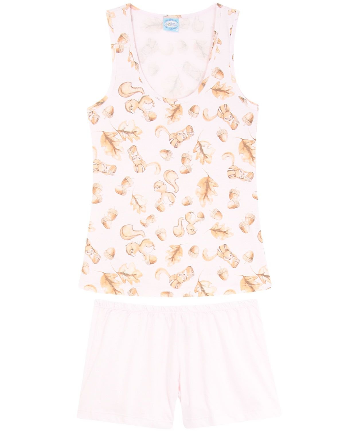 Aquele aconchego necessário, o short doll é sempre a peça favorita para garantir noites confortáveis no calor. Este modelo em 100% algodão com recorte tradicional, vem com short básico acompanhado de camiseta regata com estampa graciosa de Esquilos, completando o visual alegre e feminino na peça de verão.
