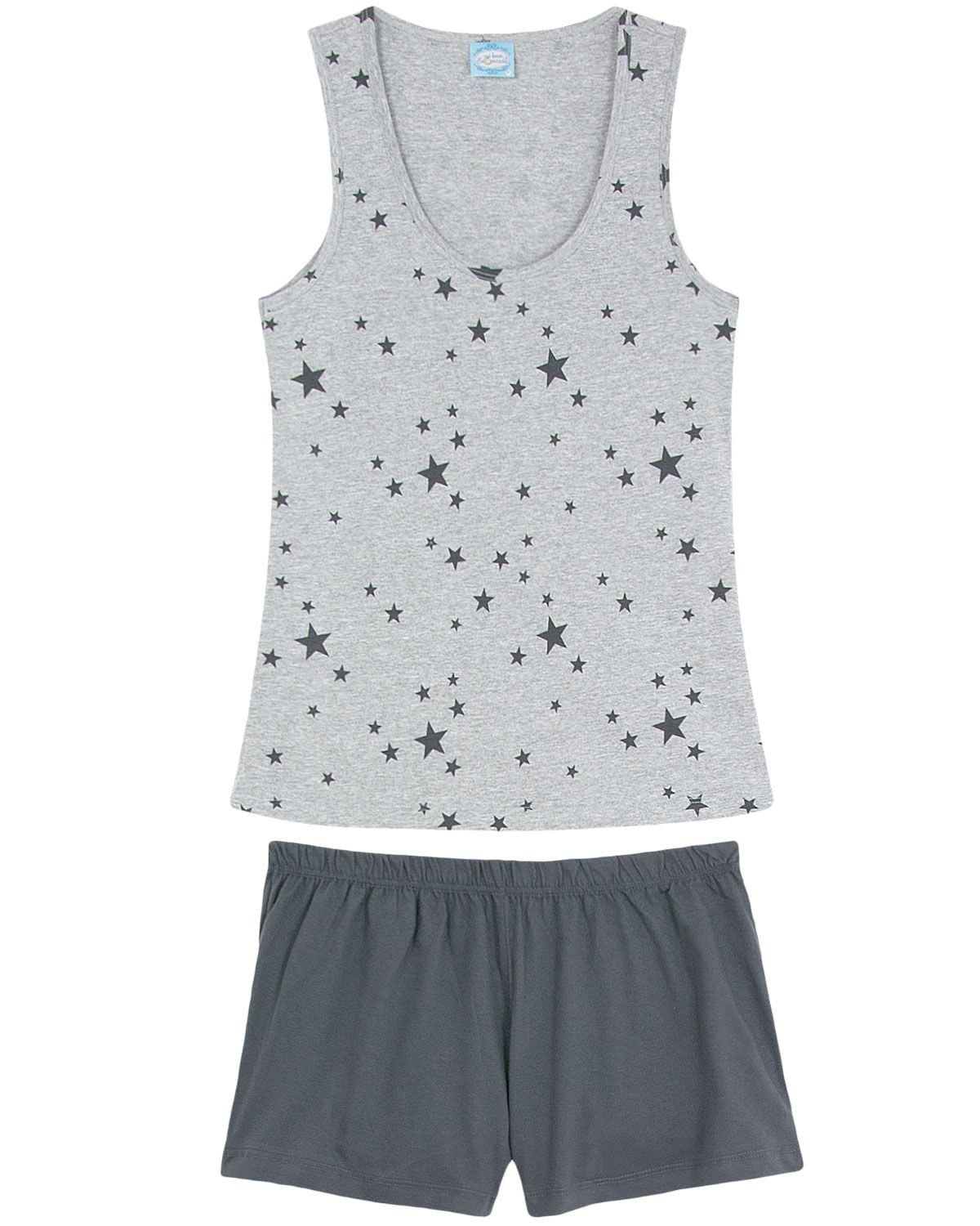 Aquele aconchego necessário, o short doll é sempre a peça favorita para garantir noites confortáveis no calor. Este modelo em 100% algodão com recorte tradicional, vem com short básico acompanhado de camiseta regata com estampa de estrelas, completando o visual alegre e feminino na peça de verão.