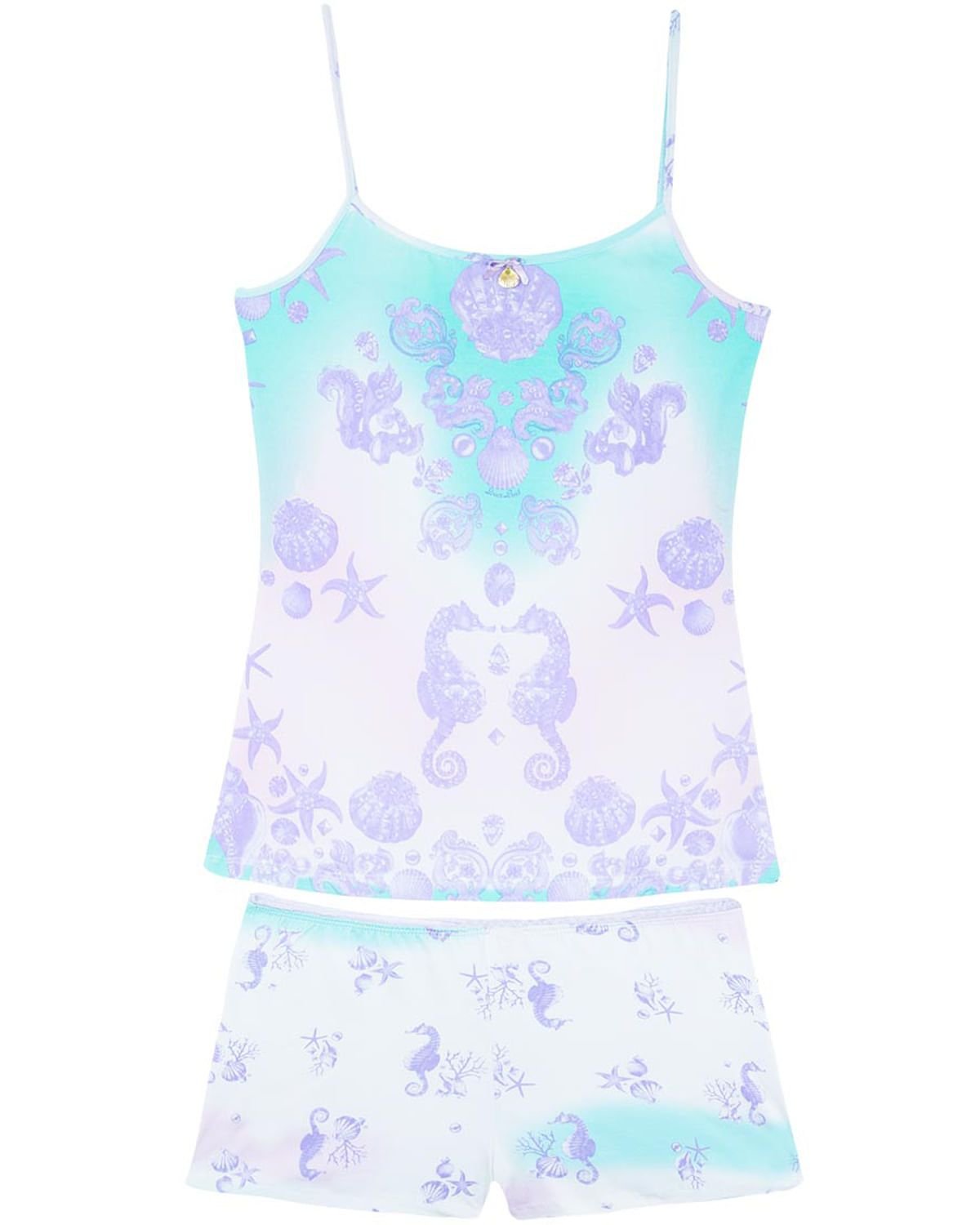 Este short doll é perfeito para noites alegres e confortáveis. Todo feito em algodão com 4% de elastano, o que proporciona um caimento perfeito modelando o corpo com conforto, com blusa de alcinha fina e short no estilo caleçon, é a peça ideal para as noites quentes de verão. Destaque para pingente de concha dourada aplicada no busto.