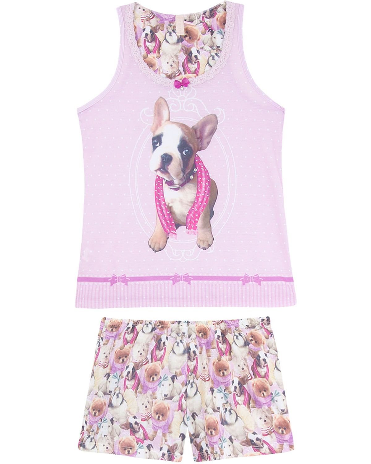 Este short doll é charmoso, delicado e fresquinho, ideal para noites de verão. Feito em malha extremamente macia e com estampa graciosa de um lindo Bulldog com aplicações de strass, para estar linda e confortável também na hora de dormir. Destaque para acabamento em renda no busto e pingente de strass aplicado no laço de cetim.