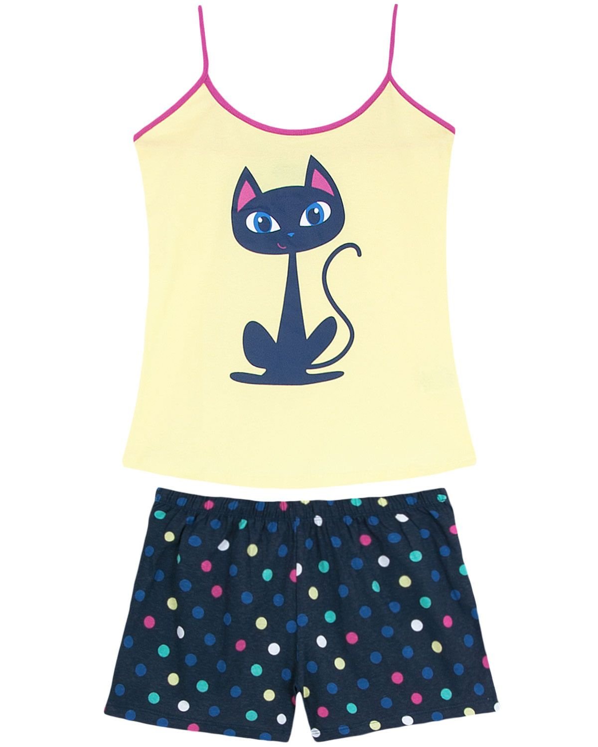 Aquele aconchego necessário e ideal para suas noites de temperatura mais quente. Todo em algodão, com short em poá colorido e blusa de alças com estampa de uma gata, completando o visual alegre e divertido nesta peça de verão. Modelo disponível também no infantil, possibilitando momentos únicos em família com um visual Tal Mãe, Tal Filha.