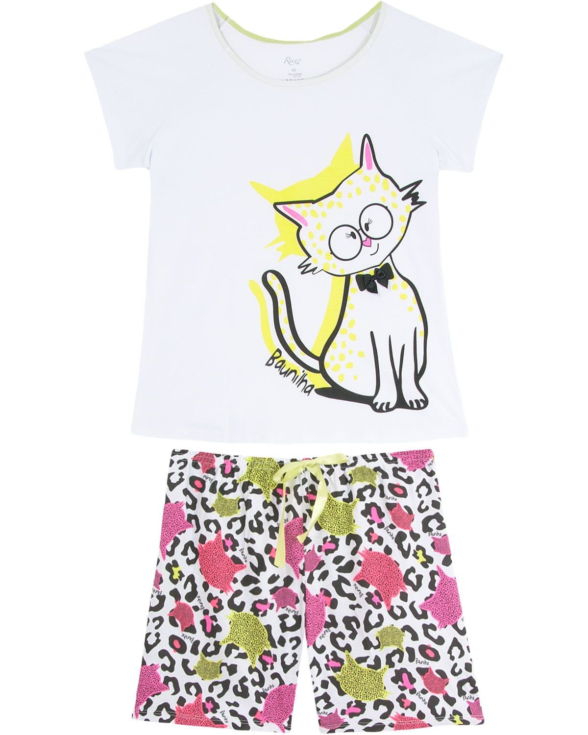 Aquele aconchego necessário e ideal para suas noites de temperatura mais quente. Todo em algodão, com estampa de gatinhos e animal print em todo o short, acompanhado de camiseta manga curta com graciosa estampa de gato com lacinho em cetim. É o pijama ideal para noites alegres, divertidas e cheias de conforto.