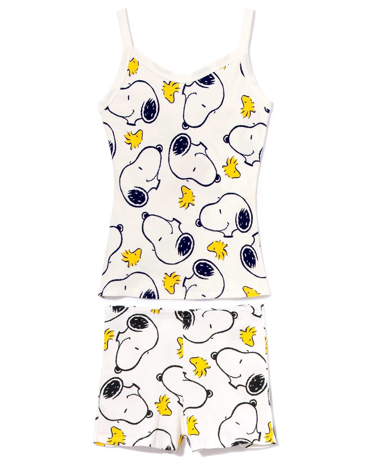 Todo o conjunto é estampado com o Snoopy e seu amigo Woodstock. Ele possui alças e decote redondo, e o short com modelagem reta que completa o look.