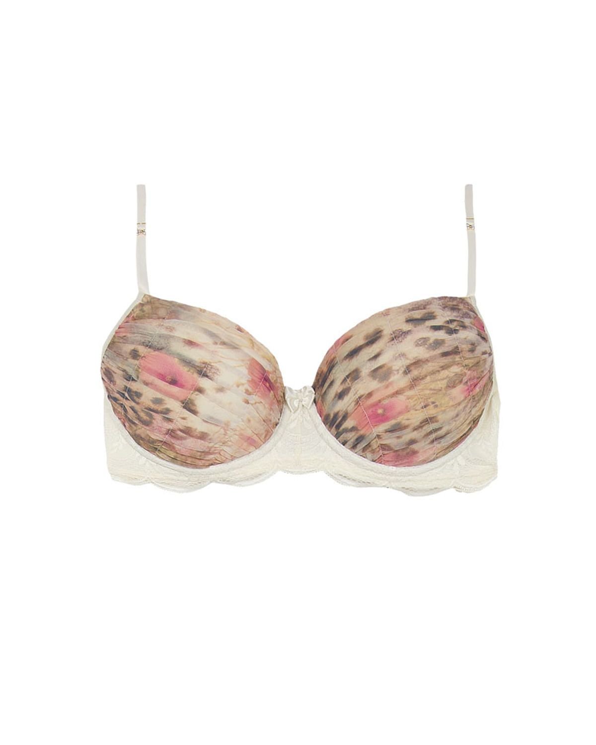 Lingerie precisa ser bonita e confortável. Surpreenda com este sutiã em renda creme com bojo estruturado inteiramente em tule drapeado com fina e suave estampa animal print com flores, proporcionando um visual fluido e leve. É a peça perfeita para aguçar a feminilidade no dia a dia e em noites especiais e românticas.